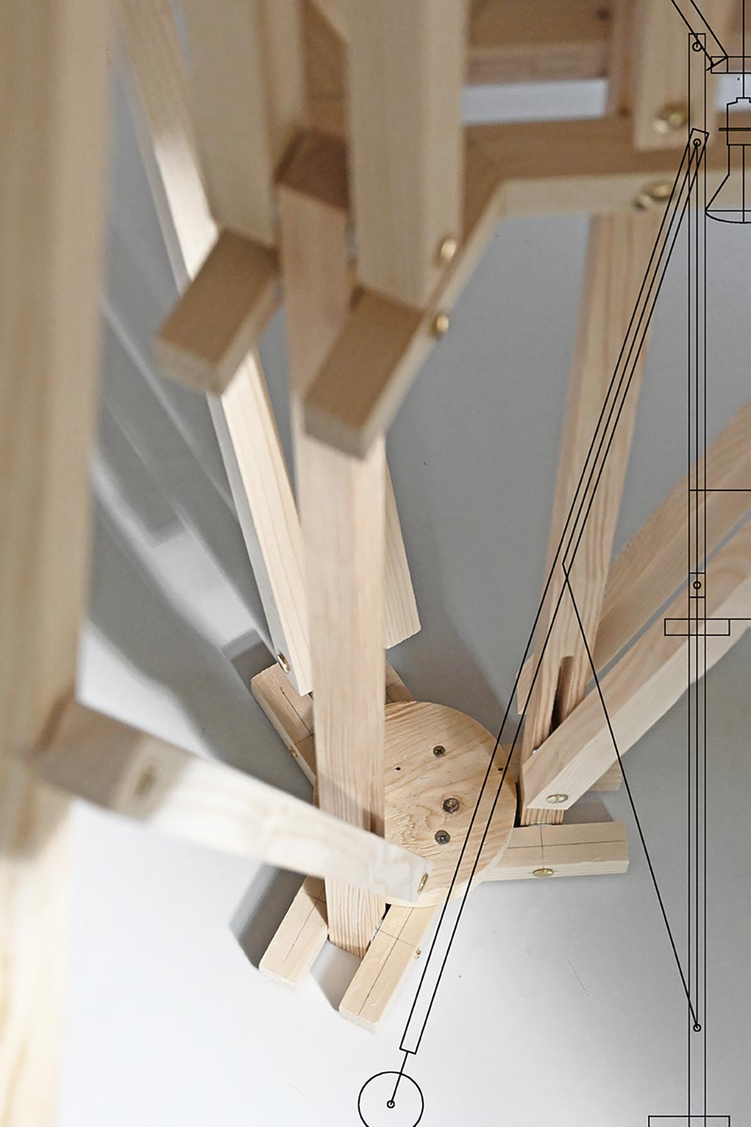 Betrachten wir die Arbeiten von Yukari Kosakai, so sehen wir filigrane Konstruktionen aus Holz – Apparate, die präzise geplant und ausgeführt wurden. Außerdem finden wir meist weißes Wachs, rote Wärmelampen, Gewichte oder metallische Federn vor. Schnell wird uns beim Betrachten klar, dass es eine Wechselwirkung zwischen den Materialien geben muss, doch die Entfaltung der in den Installationen wirkenden Kräfte, bleibt unserem kurzweiligen Blick zunächst verborgen.